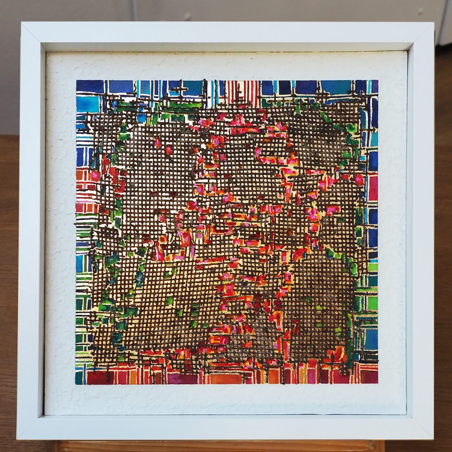 Stickerei auf Pigmentdruck Metall - Blattgold - Wachs - 62 x62 cm Wild-Seiden-Passepartout (VERKAUFT)
