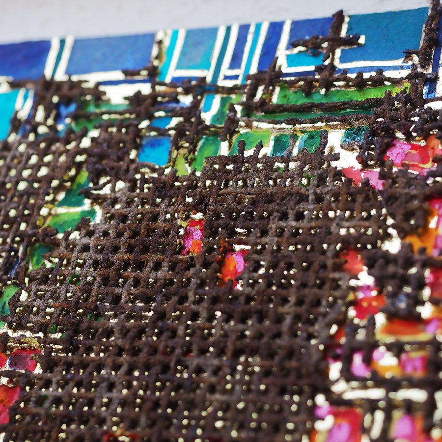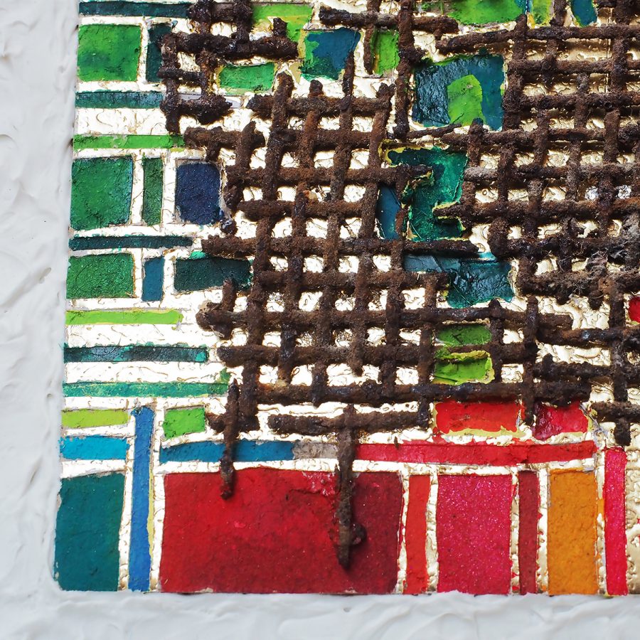Materialcollage - Eisen, Blattgold, Aquarellfarben - Format 40 x40 cm im Holzrahmen