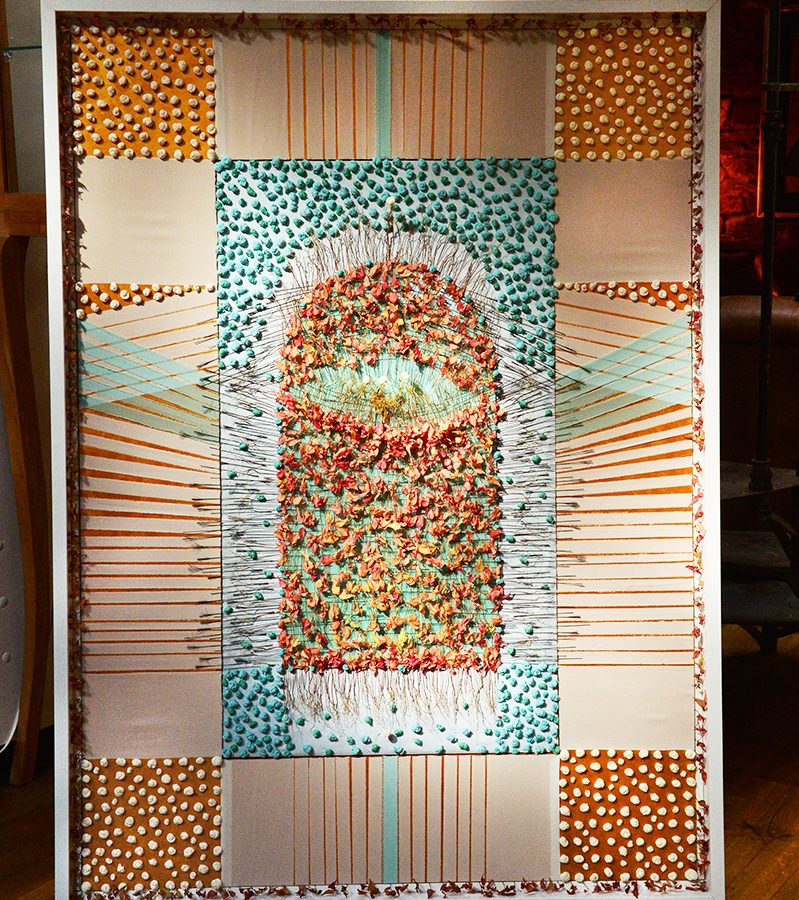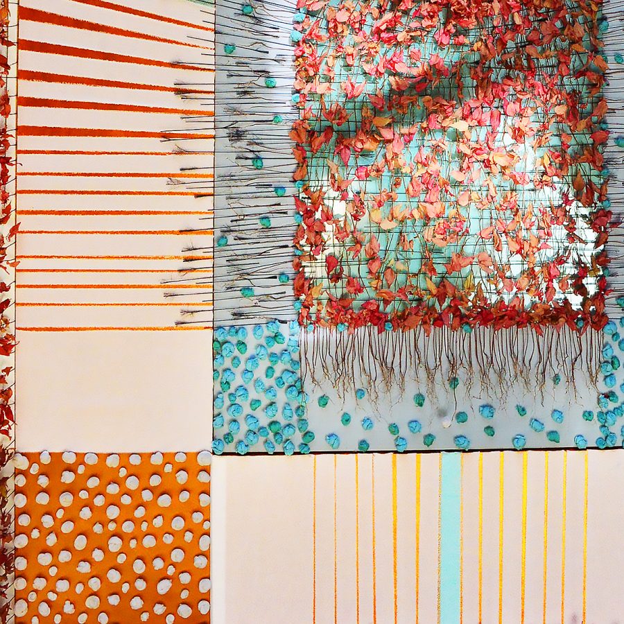 Reliefartig luftige, vielschichtige Materialcollage, Perlen, Naturmaterialien