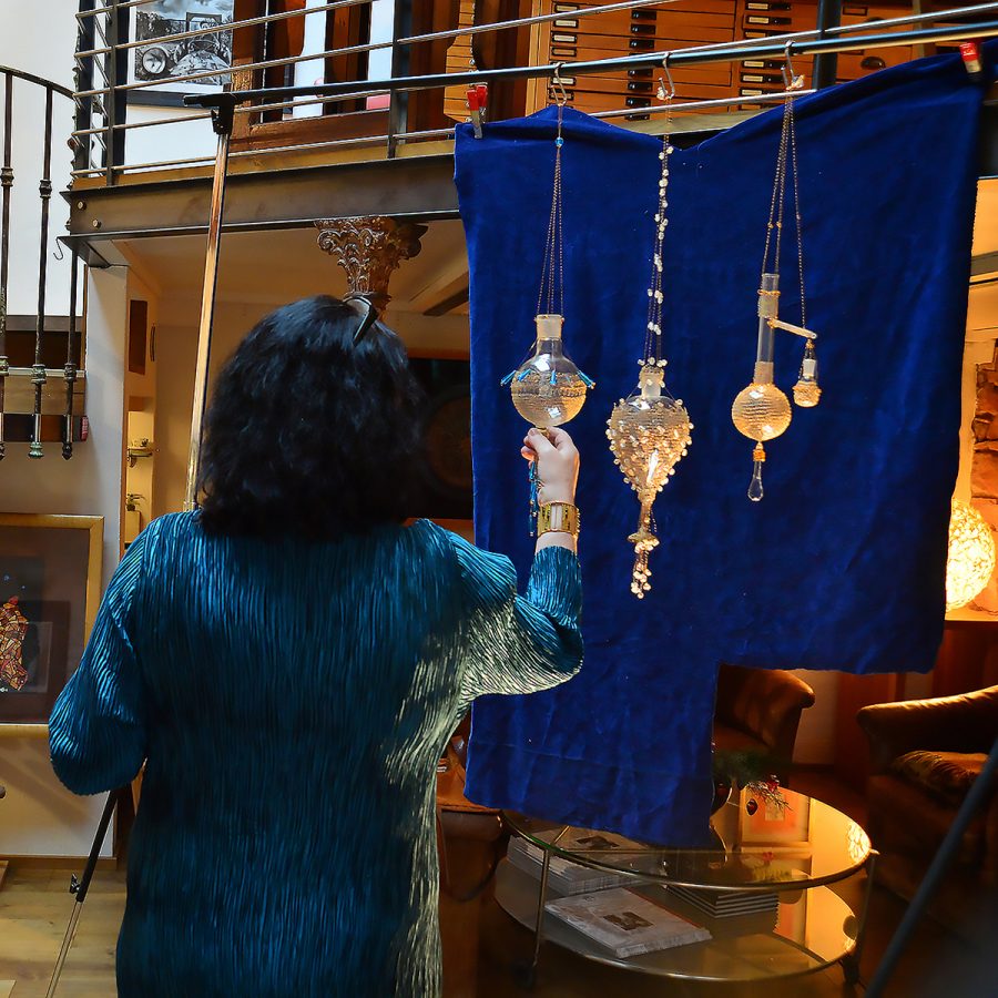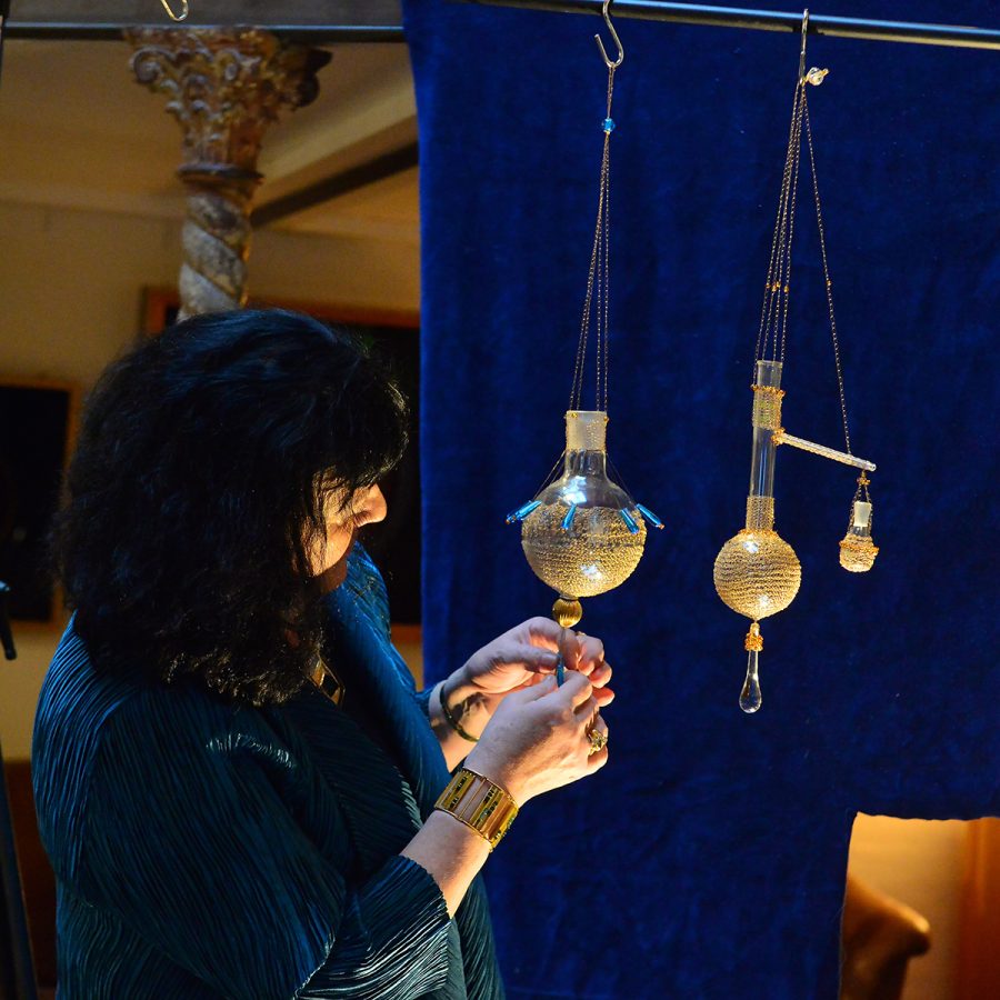 Rike Riegels-Winsauer bei der Arbeit an ihren Glas-Kunstwerken. Gehäkelter Bronzedraht, Perlen auf Glas