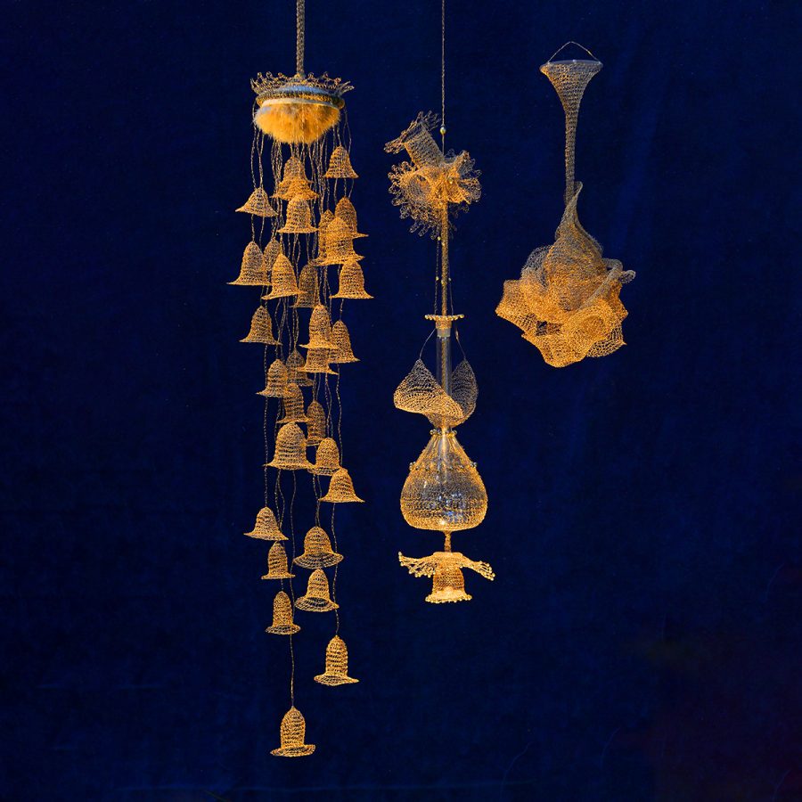 3 schwebende Kunstwerke aus gehäkeltem Bronzedraht