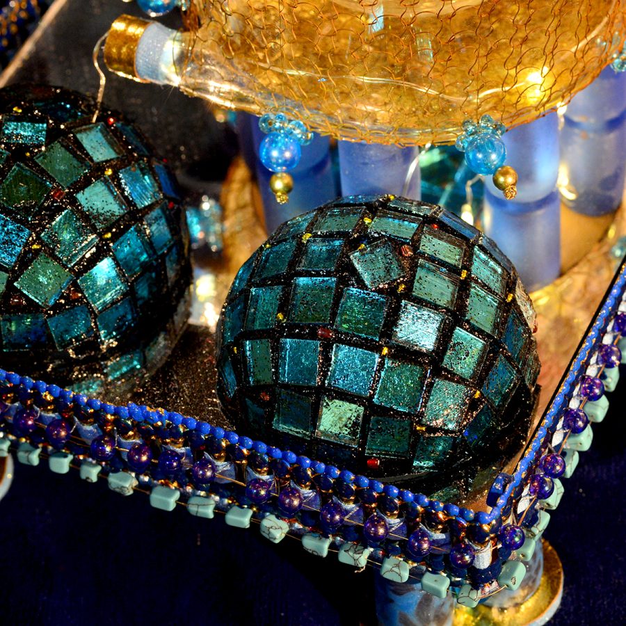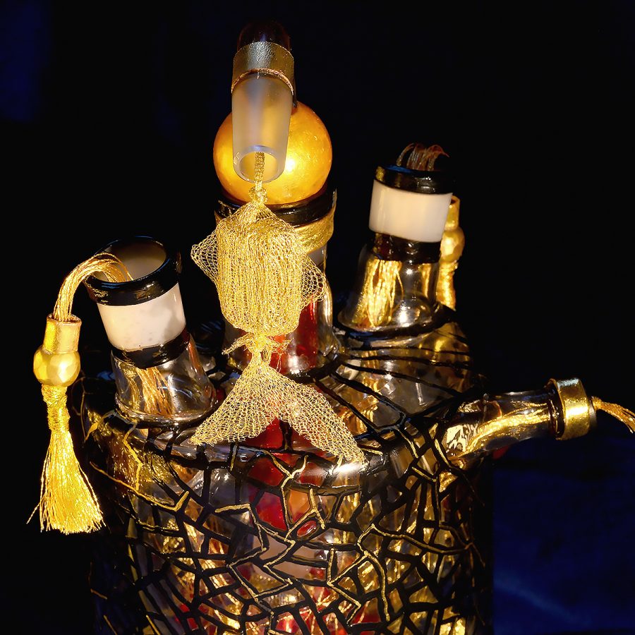 Glasobjekt mit feinem gehäkelten Bronzedraht, Glaselementen, Feingold und Licht, Detail