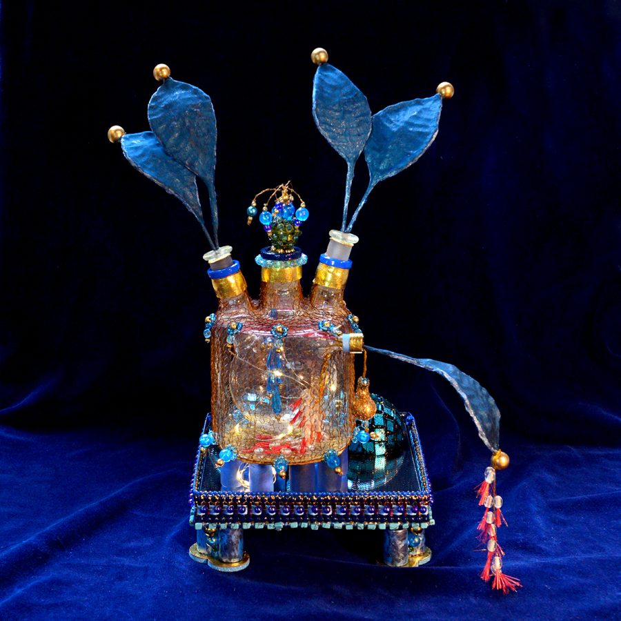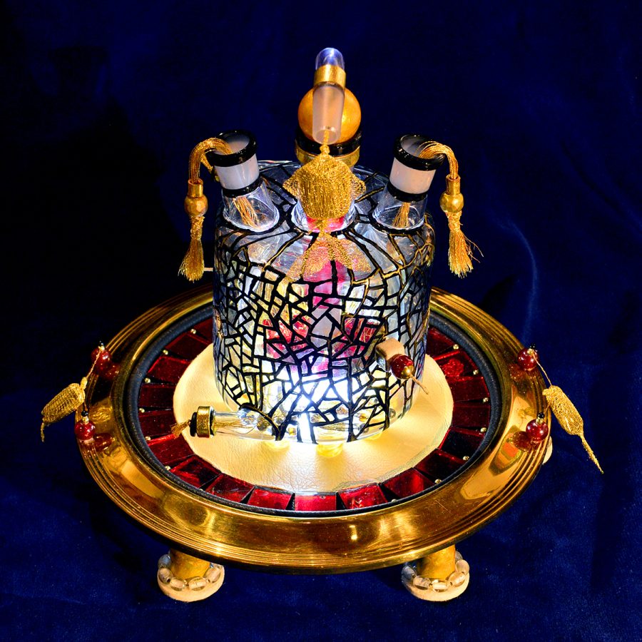 Glasobjekt mit feinem gehäkelten Bronzedraht, Glaselementen und Licht